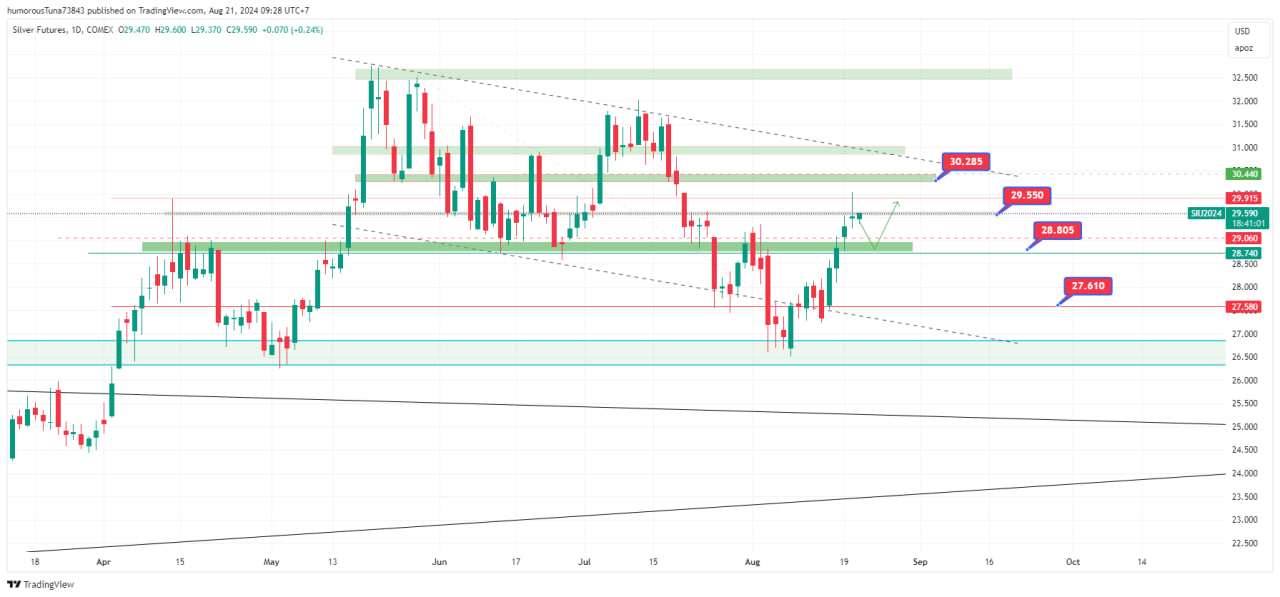 Vùng hỗ trợ 28.8x-29 $ hiện được coi là vùng hỗ trợ tin cậy. Nếu không có sự bất ngờ bởi các yếu tố cơ bản, đây là vùng tối ưu gần nhất để Nhà đầu tư mua kim loại Bạc theo xu thế nhận định tăng dài hạn trước đó.