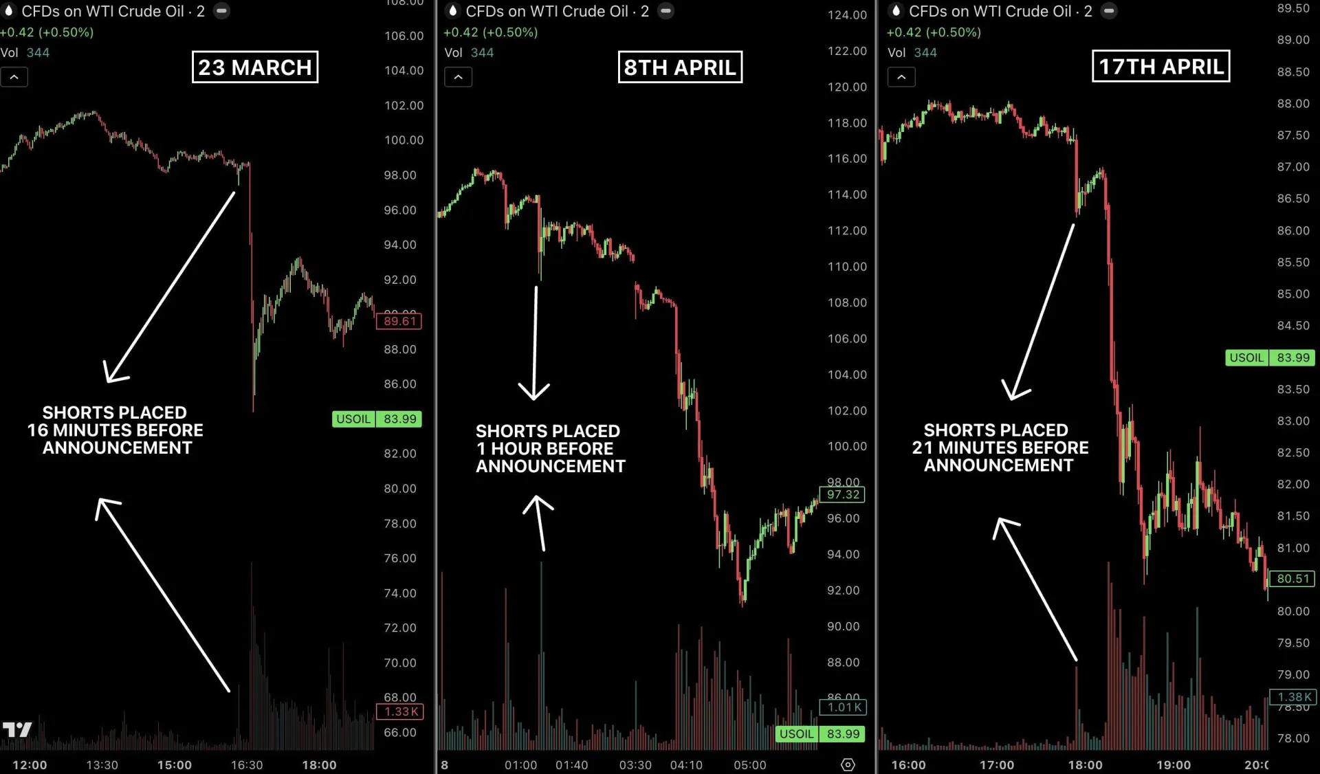 Đến ngày 7/4, thị trường tiếp tục chứng kiến 950 triệu USD lệnh bán khống xuất hiện vài giờ trước khi thông tin về lệnh ngừng bắn giữa Mỹ và Iran được công bố. Một lần nữa, giá dầu giảm mạnh.