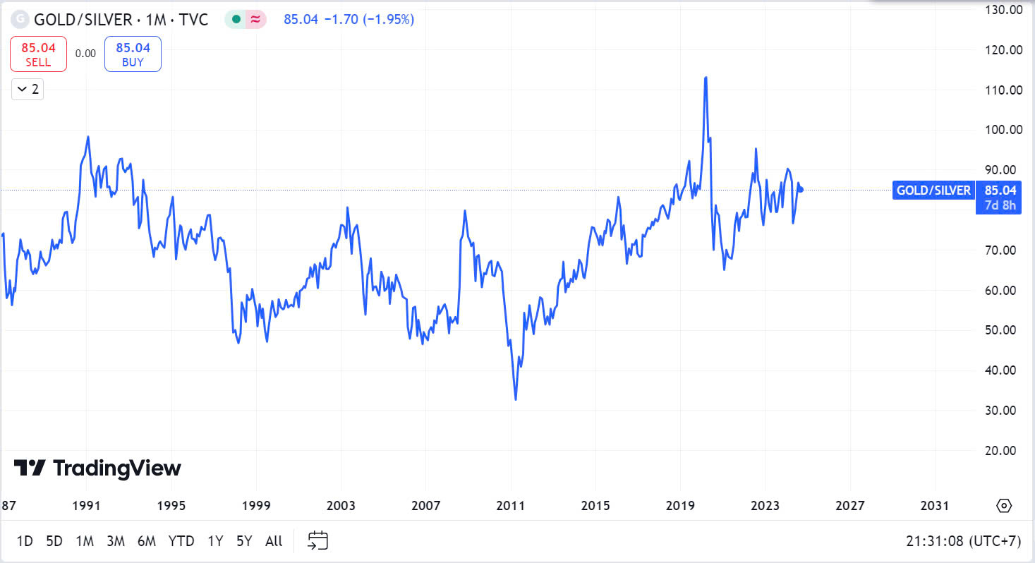Một chỉ số dự đoán giá bạc là tỷ lệ vàng/ bạc, nó phản ánh giá trị tương đối của vàng so với bạc. Theo lịch sử, khi tỷ lệ cao, điều này chỉ ra rằng bạc bị định giá thấp so với vàng, cho thấy cơ hội mua bạc tiềm năng vì nó có thể vượt trội hơn vàng trong tương lai. Ngược lại, tỷ lệ thấp cho thấy rằng bạc được định giá cao so với vàng, cho thấy điểm bán tiềm năng. Hiện tại, tỷ lệ này là trên 80, có thể khẳng định Bạc đang là rẻ so với vàng, và khả năng tăng giá sẽ là vượt trội trong tương lai.