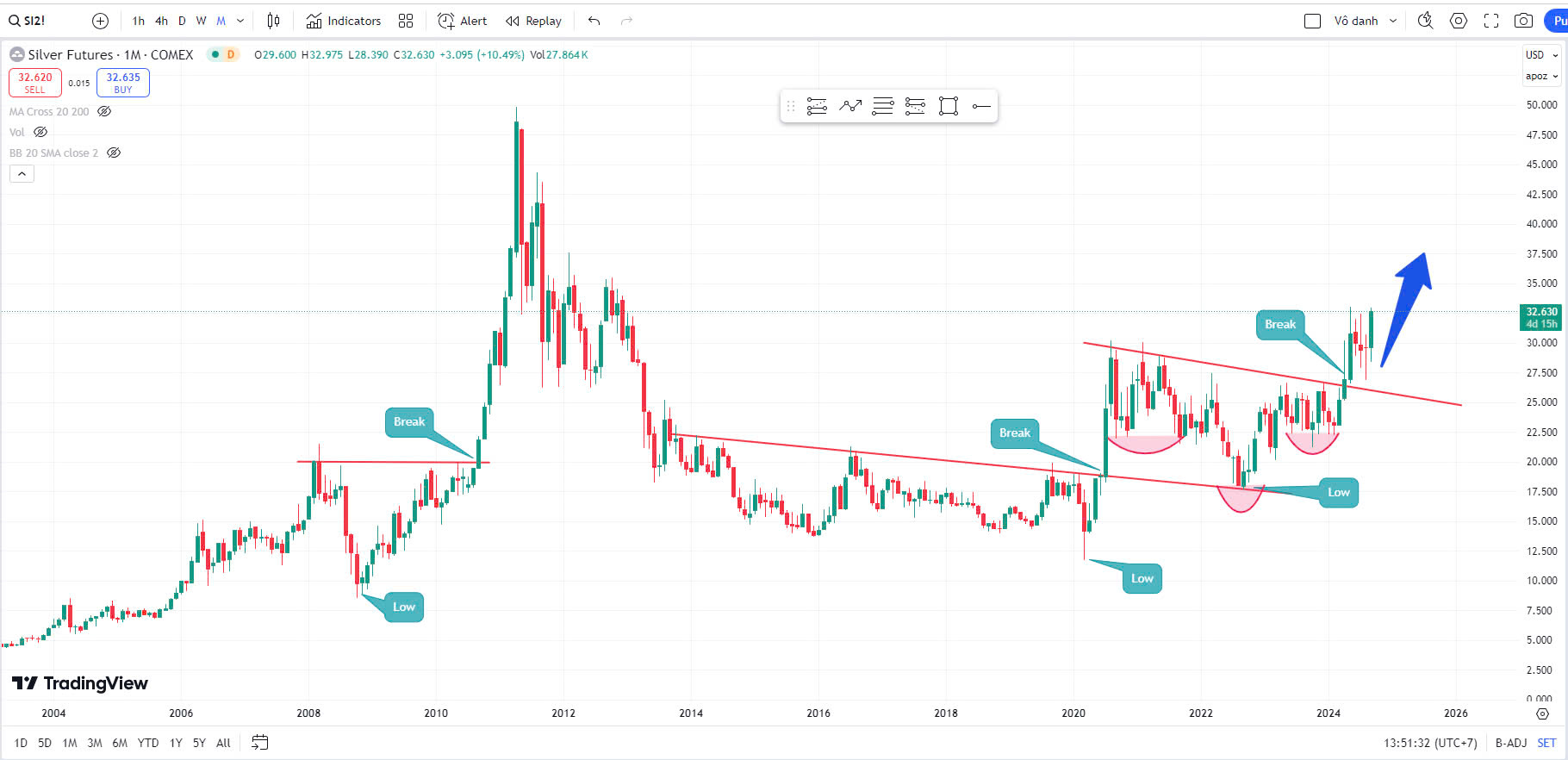 Hiện tại, sau khi hình thành mô hình đầu và vai đảo ngược trên biểu đồ hàng tháng từ năm 2021 đến năm 2023, giá bạc đang cố gắng vượt qua mức 30 đô la. Nến hàng tháng trong tháng 9 năm 2024 đang cố gắng đóng cửa trên mức quan trọng này và một sự đột phá trên mức này có khả năng sẽ khởi đầu một đợt tăng mạnh lên 50 đô la. Sự đột phá này tương tự như sau cuộc khủng hoảng năm 2008, như được thể hiện trong biểu đồ hàng tháng ở trên.