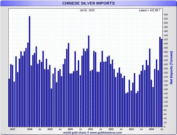 Trung Quốc nhập khẩu 13,59 triệu ounce bạc vào tháng 7.