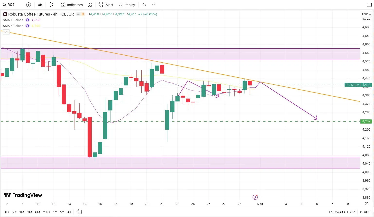 Robusta vẫn đang vận động trong vùng sideway 3,500–3,700 USD/tấn sau nhịp giảm mạnh trước đó. Cấu trúc hiện tại chưa có xu hướng rõ ràng, thị trường thiên về giao dịch theo biên.