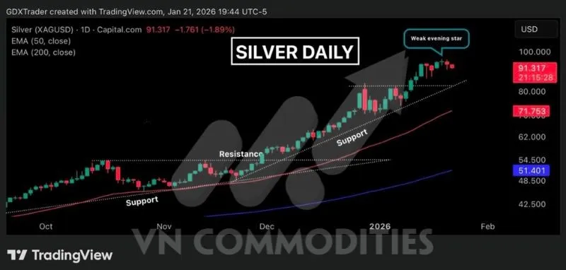 Giá bạc hình thành mô hình nến “sao hôm” yếu, cho thấy dấu hiệu chững lại ngắn hạn nhưng chưa đủ cơ sở để xác nhận một pha đảo chiều rõ ràng trong bối cảnh xu hướng chính vẫn là tăng. Động lượng đi lên đang suy yếu dần, phản ánh hoạt động chốt lời ngắn hạn hơn là áp lực bán áp đảo.