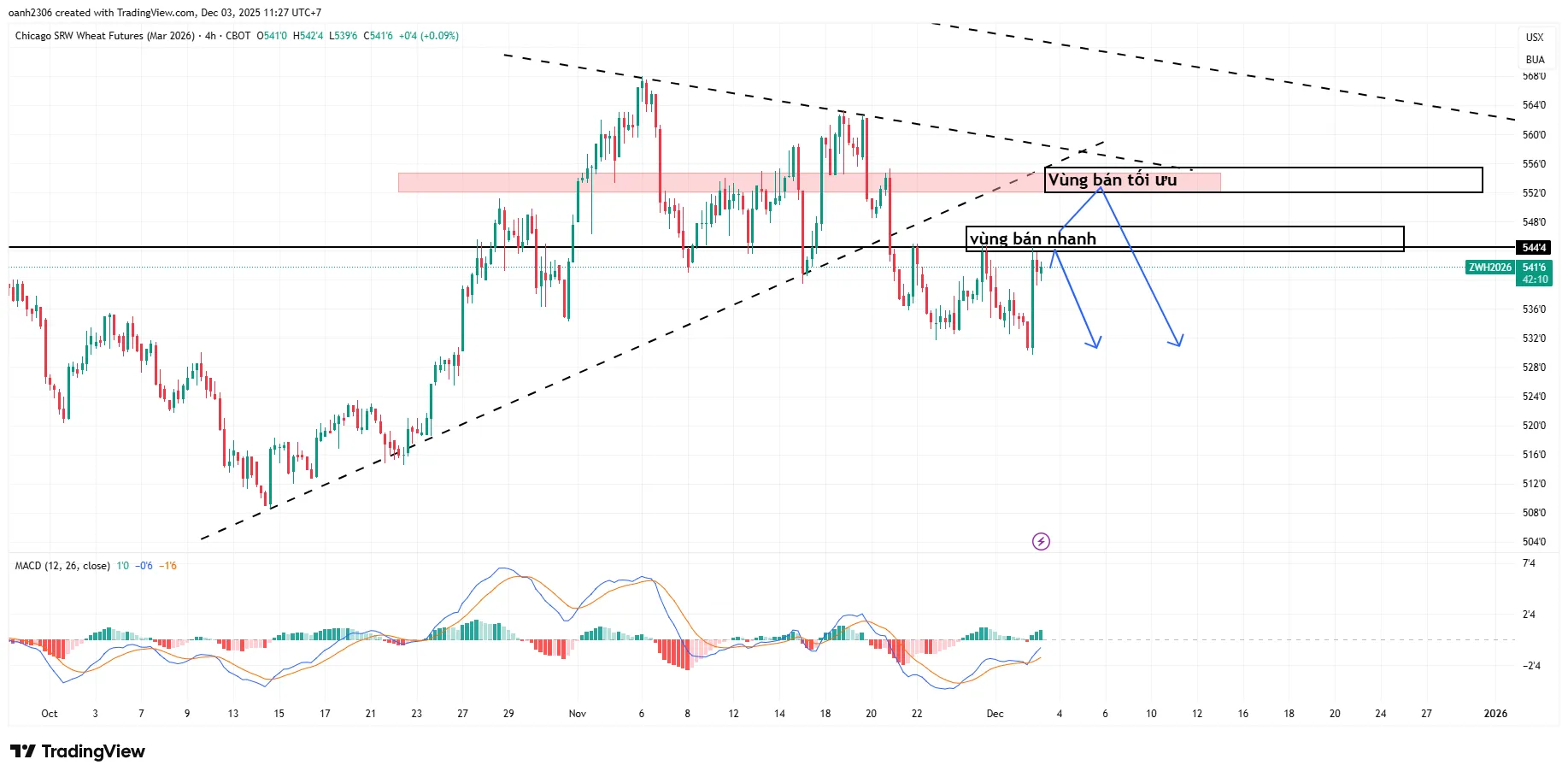 🔹 Xu hướng chính: Giảm giá dài hạn- ngắn hạn hồi phục Lúa mỳ vẫn đang đi trong kênh giảm dài hạn. Đà giảm từ vùng kháng cự 56x đang có phản ứng với vùng hỗ trợ 530 và có nhịp hồi phục, tuy nhiên biên trên vẫn đang có kháng cự 550-555 và xa hơn là 565. Giá cần vượt trên 570 để có thể xác nhận xu thế tăng.