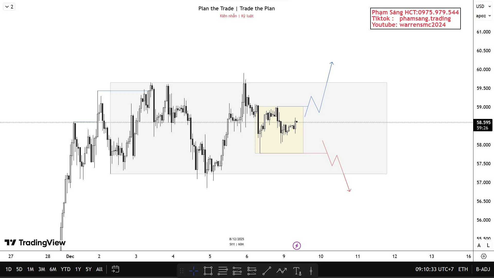 Bạc xu hướng chính tăng nhưng giá đang sideway trong biên lớn 57-59.6 và tiếp tục sideway trong biên nhỏ 58-59. Vùng biên 58-59 là biên phía trên của range lớn 57-59.6 cho thấy sự tái tích lũy để đi lên
