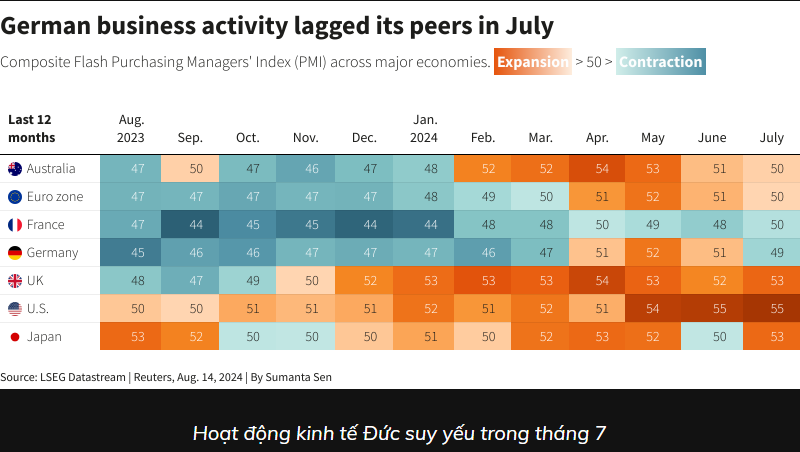 - Loạt dữ liệu PMI cung cấp một bức ảnh chụp nhanh theo thời gian thực về hoạt động kinh tế và - với hầu hết các chỉ số được công bố vào thứ năm - sẽ cung cấp bộ manh mối tiếp theo. PMI của tháng 7 cho thấy sự suy thoái kinh tế kết hợp với lạm phát dai dẳng, cho thấy lý do tại sao các ngân hàng trung ương đang trong tình thế khó khăn.