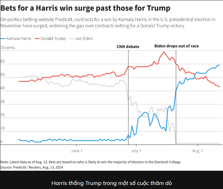 - Kể từ khi tham gia cuộc đua muộn sau khi Tổng thống Joe Biden rút lui, Harris đã khích lệ đảng Dân chủ và xóa bỏ vị trí dẫn đầu của ứng cử viên đảng Cộng hòa Donald Trump trong một số cuộc thăm dò ý kiến cũng như dẫn trước Trump tại một số cuộc thăm dò trước cuộc bỏ phiếu ngày 5 tháng 11.
