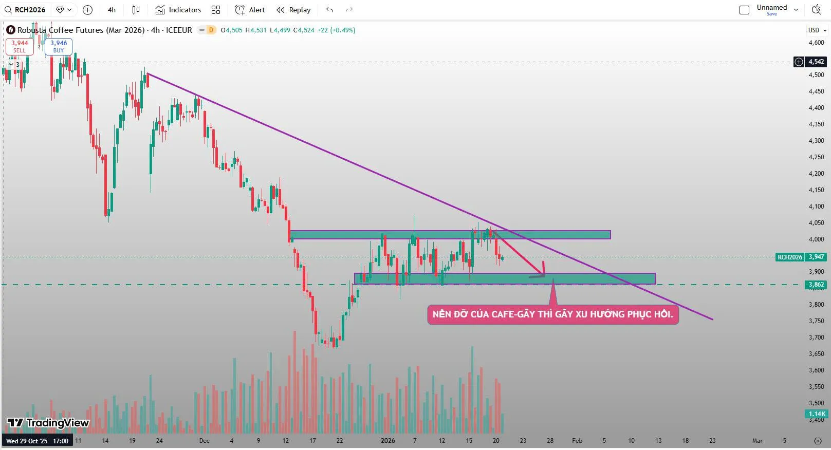 Kỳ hạn tháng 3/2026 phiên giao dịch ngày hôm qua 20/01/2026 bên mình đã cho 1 nhịp bán khống cafe từ mốc 4,020$/tấn về quanh lại mốc 3,900$/tấn.