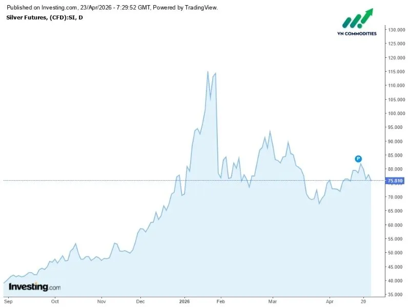 Lúc 22h05 ngày 22/4 (giờ Việt Nam), giá bạc giao ngay trên thị trường quốc tế dao động ở mức 77,71-77,96 USD/ounce. Mức giá này tăng 1,17 USD/ounce so với thời điểm mở cửa, tương đương mức tăng 1,53%.