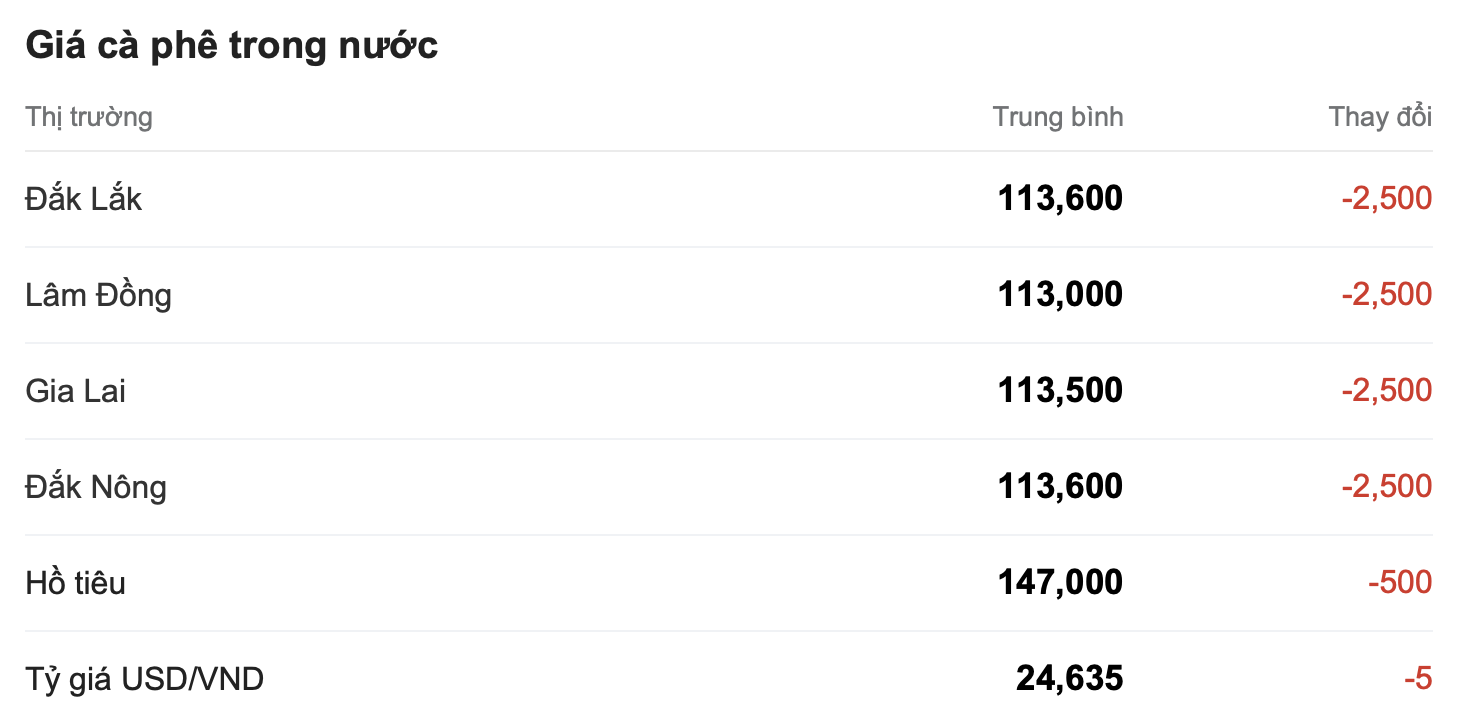 Tại huyện Cư M'gar (Đắk Lắk), giá cũng đạt 113.600 đồng/kg. Tương tự, giá thu mua tại Đắk Nông là 113.600 đồng/kg, trong khi tỉnh Gia Lai có giá cà phê ở mức 113.500 đồng/kg.