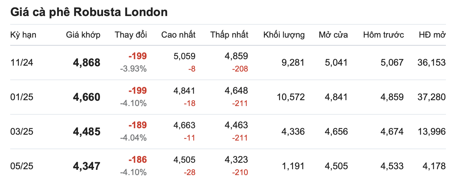Tính đến sáng 8/10, giá cà phê robusta hợp đồng giao tháng 11 trên sàn London đã giảm 3,9% (tương đương 199 USD/tấn) so với cuối tuần trước, xuống còn 4.868 USD/tấn. Hợp đồng giao tháng 1/2025 cũng giảm 4,1%, đạt 4.660 USD/tấn.
