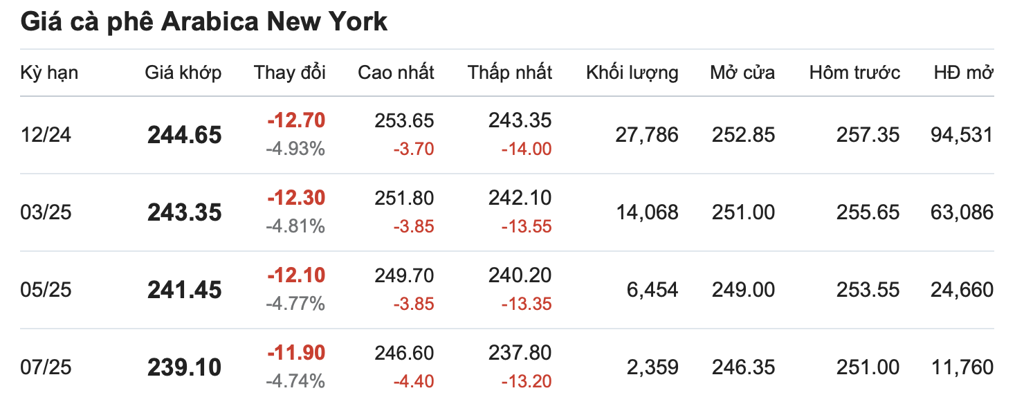 Cùng lúc đó, giá cà phê arabica hợp đồng giao tháng 12 trên sàn New York đóng cửa ở mức 244,65 US cent/pound, giảm 4,93% (12,7 US cent/pound). Hợp đồng giao tháng 3/2025 ghi nhận mức giảm 12,3%, đạt 243,35 US cent/pound.