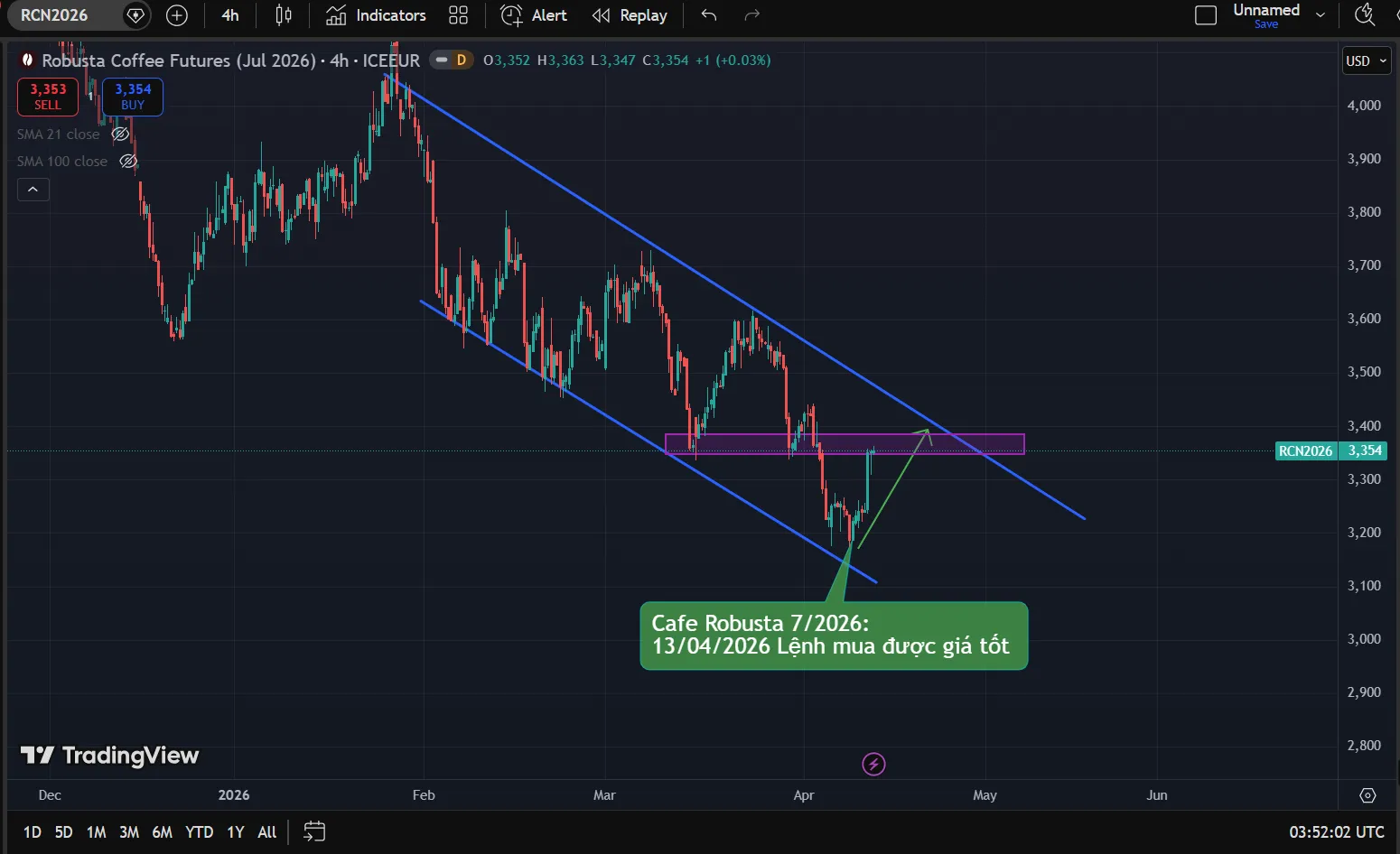 Ngày 13/04/2026 khi tín hiệu cafe xác nhận tích lũy tạo nền tốt cơ hội canh mua trên sàn giá tốt quanh mốc 3,200$/tấn đối với kỳ hạn tháng 7/2026.