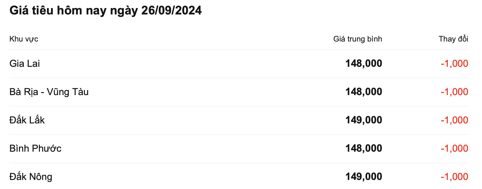 Tại Đông Nam Bộ, Bà Rịa - Vũng Tàu, Bình Phước có giá tiêu giảm 1.000 đồng/kg, cùng mức 148.000 đồng/kg.