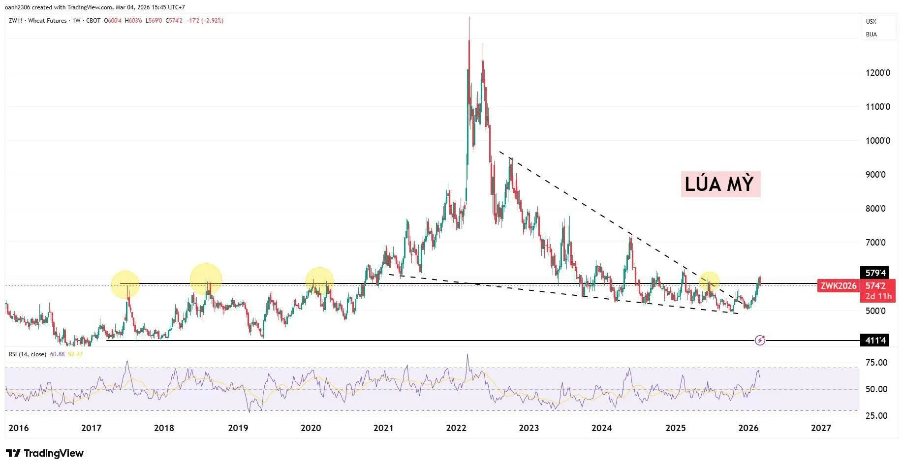 Giá đã phá vỡ trendline giảm kéo dài từ 2022 tới đầu 2026 đồng thời phá vỡ mô hình nêm tích lũy cho thấy động lượng tăng giá đang chiếm ưu thế. Tuần vừa qua, giá lúa mỳ chính thức vượt 57x -58x vùng kháng cự biên đi ngang suốt giai đoạn 2017-2020 và cũng là mức giá đỉnh của 2025, đánh dấu xu thế tăng đã nắm thế chủ đạo.