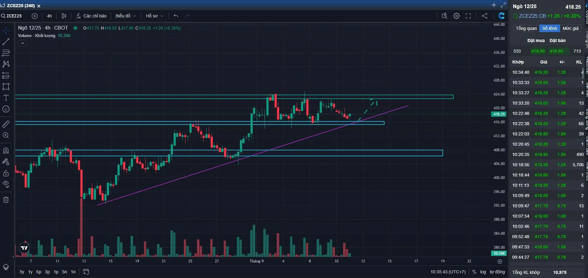 Ngô hiện tại vẫn đi ngang với mốc hỗ trợ kênh giá quanh 414.0-416.0 cent/giạ anh chị có thể ưu tiên bắt lướt sóng tai đây với kỳ vọng giá lên quanh 420.0 cent/giạ.