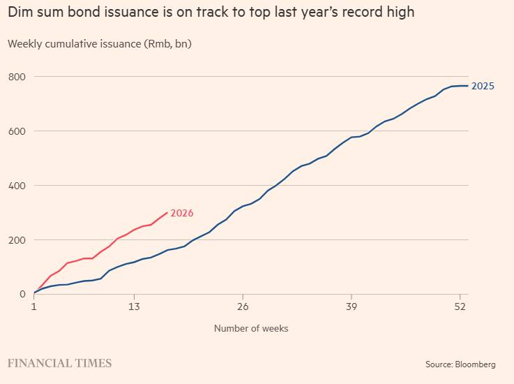 Thị trường trái phiếu dim sum — các trái phiếu được phát hành bên ngoài Trung Quốc đại lục, chủ yếu tại Hồng Kông, và được định danh bằng nhân dân tệ — đang trải qua giai đoạn bùng nổ chưa từng có. Tổng khối lượng phát hành trong năm nay đã chạm mốc 300 tỷ nhân dân tệ (tương đương khoảng 44 tỷ USD), gấp hơn hai lần so với cùng kỳ năm 2025 — vốn đã là một năm kỷ lục.