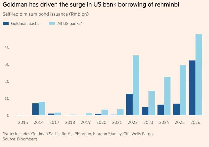 Đáng chú ý hơn, khối lượng phát hành tự quản lý của các ngân hàng Mỹ — tức các giao dịch mà họ tự tổ chức mà không cần bên trung gian — đã đạt 47,5 tỷ nhân dân tệ, cũng là mức kỷ lục trong lịch sử. Trong đó, Goldman Sachs chiếm phần lớn, trở thành nhà phát hành nước ngoài lớn nhất trên thị trường trái phiếu dim sum và đứng thứ hai toàn thị trường, chỉ sau Ngân hàng Trung Quốc — định chế quốc doanh. Riêng Goldman đã huy động được 32,1 tỷ nhân dân tệ thông qua các trái phiếu này trong năm nay, chiếm khoảng 10% tổng lượng phát hành.