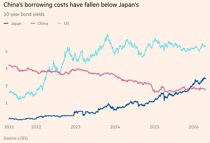 Trong nhiều thập kỷ, đồng yên Nhật đã đảm nhận vai trò này nhờ môi trường lãi suất gần bằng 0 của Nhật Bản. Tuy nhiên, kể từ đầu năm 2024, lợi suất trái phiếu chính phủ Nhật Bản kỳ hạn 10 năm đã tăng vọt từ 0,61% lên hơn 2,4% — một sự dịch chuyển có ý nghĩa lớn đối với chi phí vay mượn bằng đồng yên. Tháng 11 năm ngoái, lần đầu tiên trong lịch sử, lợi suất trái phiếu chính phủ Trung Quốc kỳ hạn tương đương đã xuống thấp hơn trái phiếu Nhật.