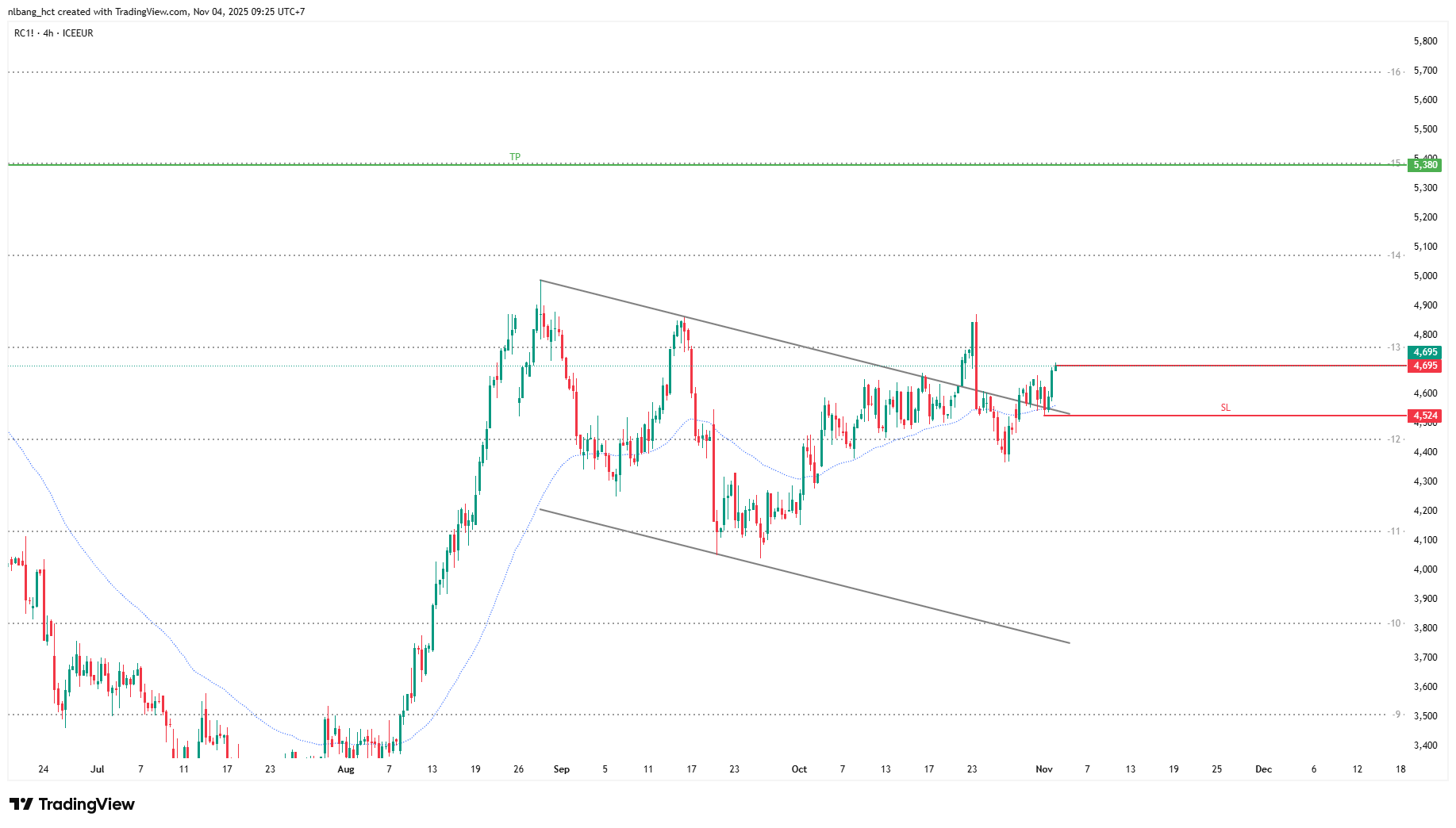 Robusta vẫn đang vận động trong vùng sideway 3,500–3,700 USD/tấn sau nhịp giảm mạnh trước đó. Cấu trúc hiện tại chưa có xu hướng rõ ràng, thị trường thiên về giao dịch theo biên. Vùng hỗ trợ gần nằm quanh 3,580–3,600 , trong khi kháng cự ngắn hạn ở 3,680–3,720 . Nếu chưa có lực phá vỡ...