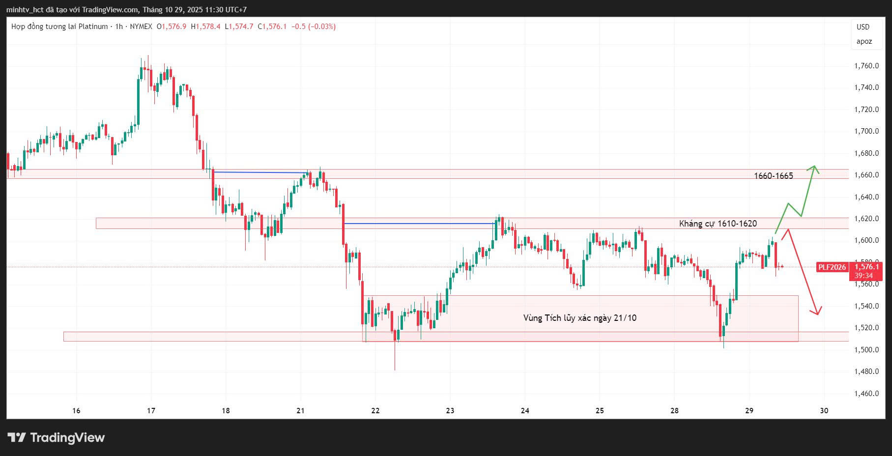 Hôm qua Bạch Kim đi theo kịch bản 2 về vùng tích lũy sau đó bật tăng trở lại cho thấy phe mua đã tham gia mua mạnh phai vùng này. Tuy nhiên về mặt cấu trúc bạch kim vẫn chưa phá vỡ pha giảm và chuyển về pha tăng do chưa có xác nhận. Vì vậy phiên hôm nay chúng ta sẽ quan sát vùng kháng cự 1600-1610, nếu giá phá qua vùng này và đóng xác nhận chúng ta sẽ canh mua trở lại, nếu bị từ chối đà tăng chúng ta canh bán tại vùng kháng cự.