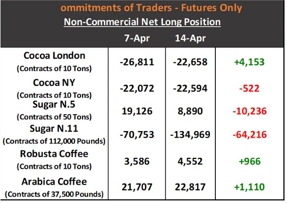 Dữ liệu vị thế từ Ủy ban Giao dịch Hàng hóa Tương lai Hoa Kỳ cho thấy dòng tiền đầu cơ đang phân hóa khá rõ giữa các mặt hàng NLCN. Quỹ đầu cơ tăng mua ròng đối với cà phê robusta và arabica. Ngược lại, đường chịu áp lực chốt lời hoặc cắt giảm vị thế rất mạnh, đặc biệt là đường thô New York. Với ca cao, vị thế đầu cơ cũng trái chiều giữa thị trường London và New York, cho thấy tâm lý thị trường hiện chưa thật sự đồng thuận.