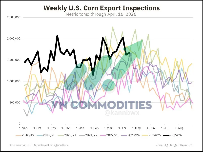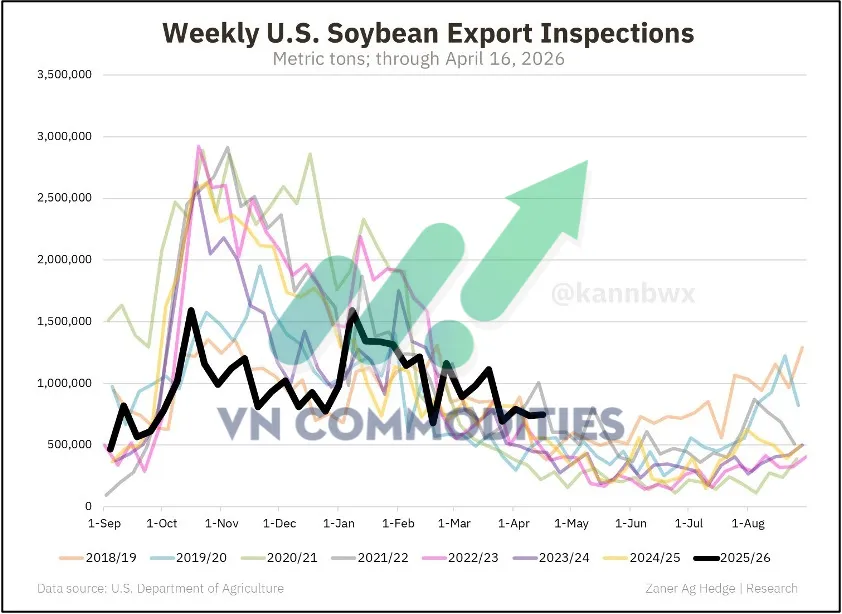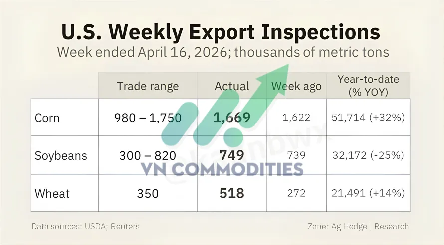 Kiểm định xuất khẩu nông sản của Hoa Kỳ trong tuần kết thúc ngày 16/4 nhìn chung phù hợp với kỳ vọng thị trường, trong đó ngô tiếp tục là điểm sáng khi đạt 1,669 triệu tấn, duy trì trên mức cần thiết để hoàn thành mục tiêu xuất khẩu cả niên vụ. Khoảng 40% lượng ngô kiểm định trong tuần được xuất sang Hàn Quốc và 15% sang Mexico. Với đậu tương, khoảng 60% khối lượng kiểm định trong tuần hướng tới Trung Quốc. Trong khi đó, lúa mì đạt 518 nghìn tấn, cao hơn rõ rệt so với tuần trước.