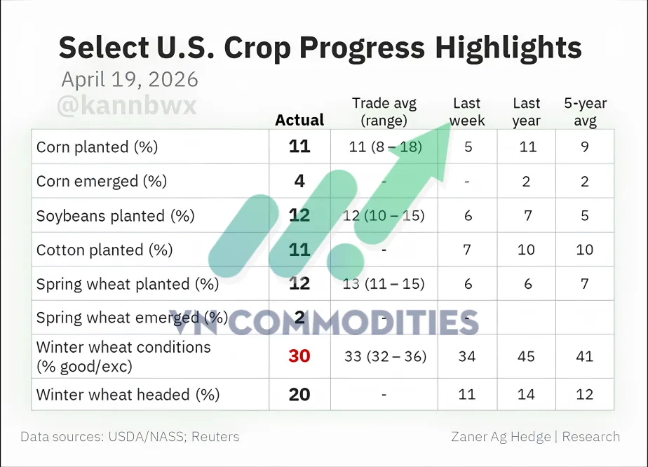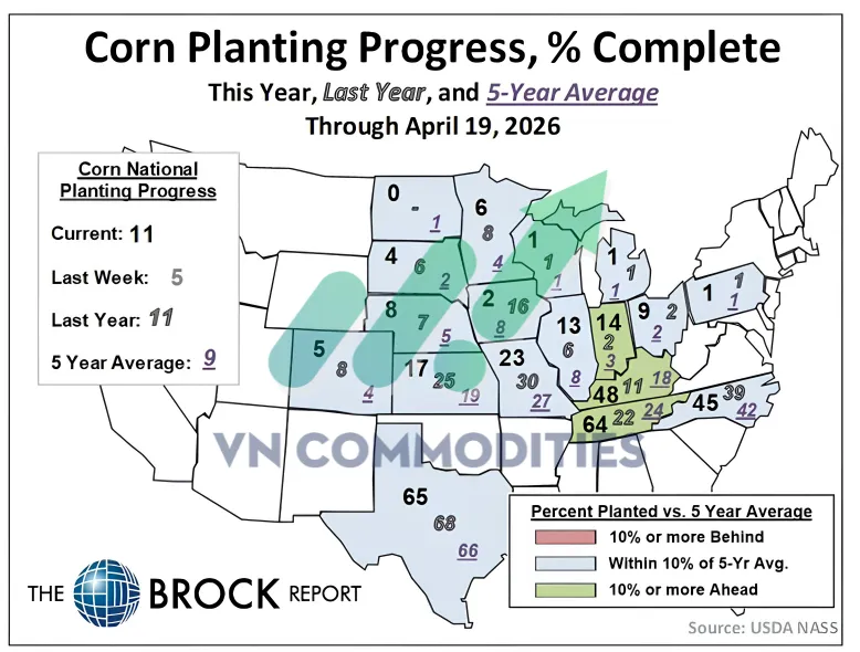 Tiến độ gieo trồng ngô của Hoa Kỳ hiện đạt 11%, đúng bằng cùng kỳ năm ngoái và nhỉnh hơn mức trung bình 5 năm là 9%. Điểm nổi bật là bang Indiana tăng tốc rất mạnh trong tuần qua khi gieo thêm 12% diện tích, trong bối cảnh nhiều khu vực khác ở Trung Tây bị mưa làm chậm tiến độ.