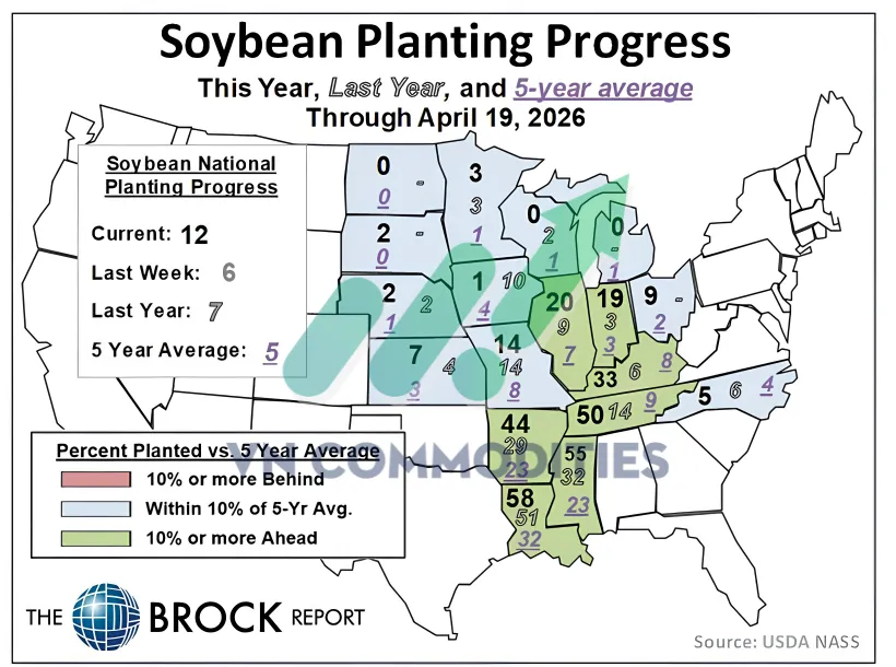 Tiến độ gieo trồng đậu tương của Hoa Kỳ hiện đạt 12%, cao hơn mức kỷ lục cũ 9% của cùng tuần và cũng vượt xa mức 8% của hai năm gần nhất trong khi đó mức trung bình 5 năm chỉ 5%.