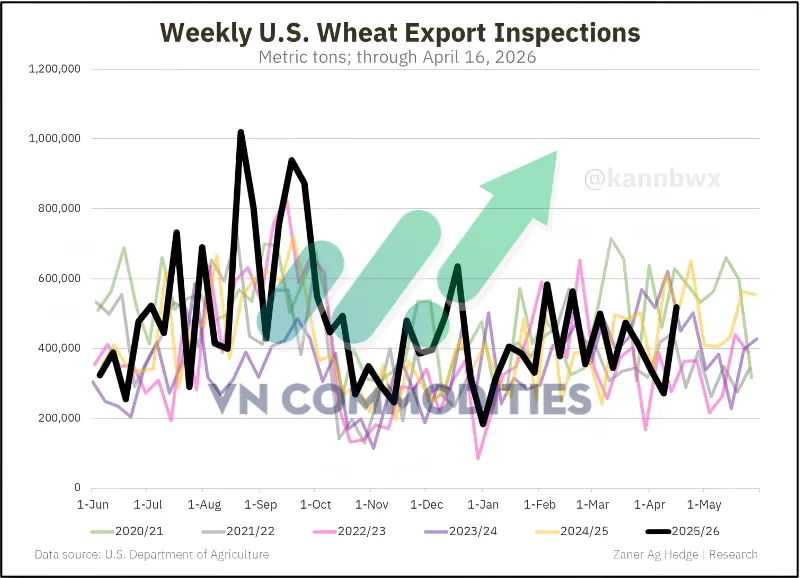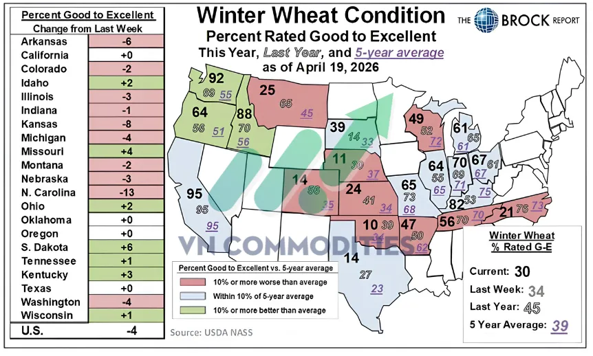 Chất lượng lúa mì vụ đông của Hoa Kỳ tiếp tục giảm thêm 4 điểm phần trăm trong tuần này, xuống còn 30% tốt/xuất sắc, thấp hơn đáng kể so với mức trung bình 10 năm khoảng 46%. Đáng chú ý, Kansas, bang chiếm hơn 20% sản lượng lúa mì vụ đông của Hoa Kỳ, hiện chỉ có 24% diện tích được xếp loại tốt/xuất sắc, thấp hơn nhiều so với mức trung bình 10 năm gần 40%.