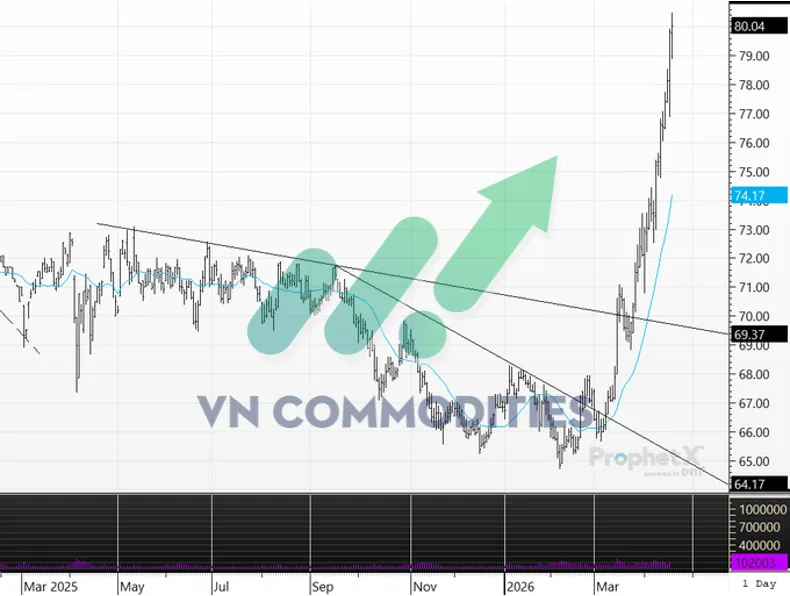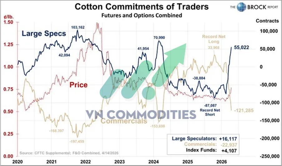 Dữ liệu vị thế từ Ủy ban Giao dịch Hàng hóa Tương lai Hoa Kỳ đang phát đi tín hiệu khá đáng chú ý đối với thị trường bông. Nhóm đầu cơ đã liên tục mua ròng từ cuối tháng 2 và ghi nhận tuần mua ròng mạnh nhất kể từ tháng 4/2016, cho thấy dòng tiền đầu cơ đang quay lại rất rõ. Cùng lúc, hợp đồng bông tháng 7 chưa đóng cửa dưới đáy của phiên trước kể từ ngày 20/3, phản ánh xu hướng giá ngắn hạn vẫn khá vững.
