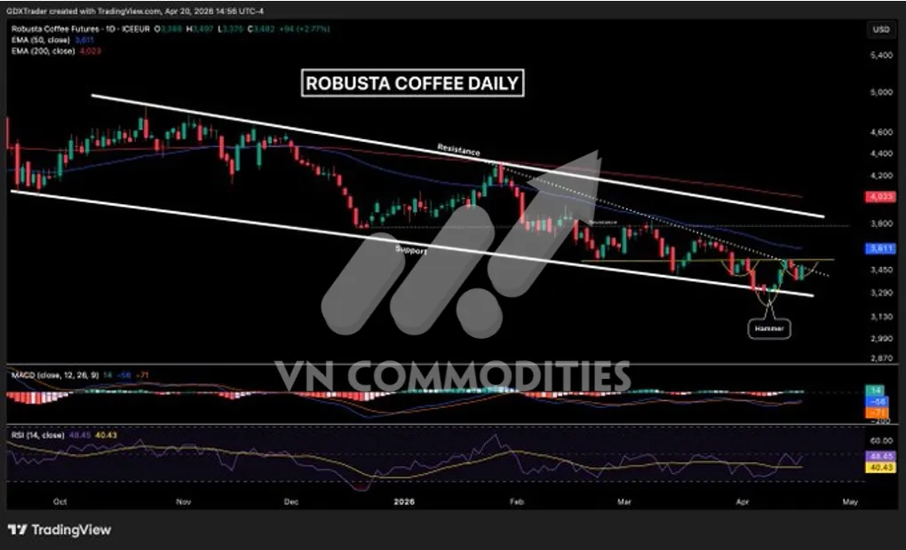 Cà phê robusta vẫn đang trong xu hướng giảm. Dù xuất hiện tín hiệu hồi phục ngắn hạn, giá hiện chủ yếu vẫn là đi ngang tích lũy sau nhịp giảm mạnh trước đó. Lực mua có dấu hiệu quay lại ở vùng thấp, nhưng xu hướng giảm lớn vẫn chưa bị phá vỡ. Vì vậy, các nhịp tăng hiện tại nên được xem là hồi kỹ thuật, chưa phải tín hiệu đảo chiều rõ ràng.