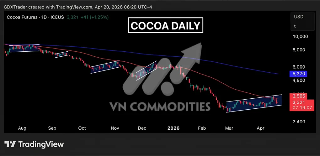 Ca cao vẫn đang trong xu hướng giảm rõ ràng. Giá bị từ chối tại đường EMA 50 và vùng kháng cự phía trên, cho thấy bên bán vẫn kiểm soát thị trường. Cây nến doji mới xuất hiện phản ánh tâm lý do dự, nhưng khi giá vẫn nằm dưới các đường trung bình động dốc xuống, xu hướng giảm lớn vẫn chưa thay đổi.