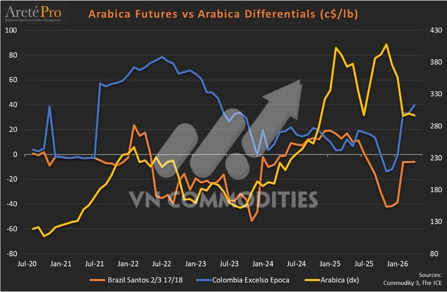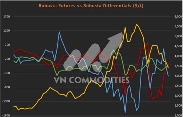 Chênh lệch giá cà phê thực đang biến động khá khác nhau giữa robusta và arabica. Với robusta, giá hợp đồng tương lai tăng mạnh nhưng chênh lệch giá hàng thực cũng biến động rất lớn. Trong khi đó, ở arabica, giá tương lai tăng khá rõ nhưng chênh lệch giá của các nguồn cung thực không tăng tương ứng.