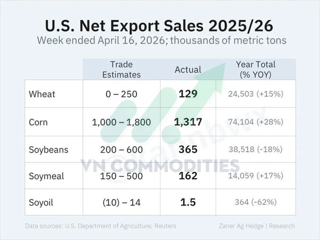 Doanh số xuất khẩu của Hoa Kỳ trong tuần trước nhìn chung phù hợp với kỳ vọng. Khối lượng đậu tương ở mức trung bình so với cùng kỳ tuần, trong khi doanh số ngô cao hơn mức trung bình. Tổng cam kết mua đậu tương của Trung Quốc hiện ở mức 11,5 triệu tấn, còn khoảng 1,45 triệu tấn chưa giao.