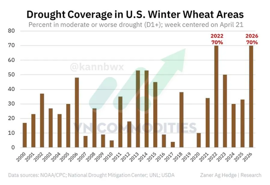 Khoảng 70% diện tích lúa mì vụ đông của Hoa Kỳ hiện đang nằm trong vùng hạn hán, tương đương mức kỷ lục của năm 2022 trong cùng tuần. Đây cũng là tỷ lệ bao phủ hạn hán cao nhất đối với lúa mì vụ đông kể từ tháng 12/2022.