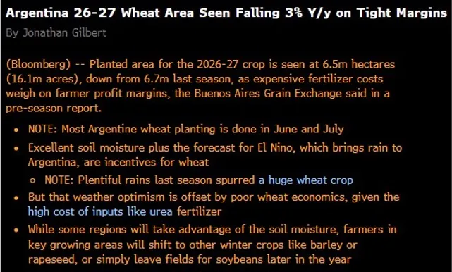Diện tích gieo trồng lúa mì của Argentina niên vụ 2026/27 được dự báo giảm khoảng 3% so với cùng kỳ năm trước, do biên lợi nhuận của nông dân bị thu hẹp bởi chi phí phân bón và nhiên liệu vẫn ở mức cao. Dù độ ẩm đất đang khá thuận lợi và thời tiết có thể hỗ trợ gieo trồng, hiệu quả kinh tế yếu của lúa mì đang khiến nhiều nông dân cân nhắc chuyển sang các cây trồng khác như lúa mạch, cải dầu hoặc để đất cho đậu tương muộn hơn trong năm.