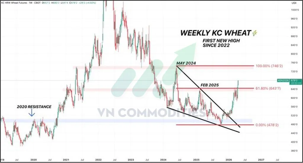 Lúa mì Kansas đã ghi nhận đỉnh cao hơn đầu tiên kể từ năm 2022, cho thấy cấu trúc giá đang có dấu hiệu cải thiện rõ rệt. Trước đó, mọi nhịp tăng trong 4 năm qua đều không thể vượt được đỉnh cũ, nhưng lần này thị trường đã phá vỡ vùng đỉnh của năm 2025, đồng thời vượt qua mốc thoái lui 61,8% của đỉnh năm 2024. Đây là một vùng kháng cự quan trọng, nên việc giá gặp khó trong lần bứt phá đầu tiên là điều bình thường.
