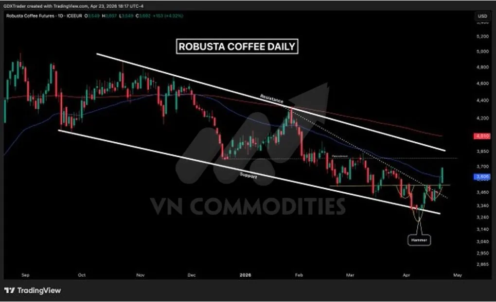 Cà phê robusta đang phát tín hiệu cải thiện kỹ thuật khi giá vượt đường viền cổ của mô hình vai đầu vai ngược, cho thấy khả năng hình thành một nhịp đảo chiều tăng sau giai đoạn giảm trước đó. Diễn biến này phản ánh lực mua đang quay trở lại và cấu trúc giá ngắn hạn đang tích cực hơn. Tuy nhiên, để xu hướng hồi phục được xác nhận rõ hơn, giá vẫn cần giữ vững vùng vừa bứt phá và tiếp tục duy trì đà tăng trong các phiên tới.