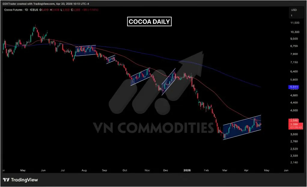 Ca cao vẫn đang vận động trong kênh tăng, nhưng diễn biến giá nhìn chung còn yếu khi liên tục đi ngang bên dưới đường EMA 50, hiện đóng vai trò là vùng kháng cự gần. Dù cấu trúc giá chưa xấu hẳn, việc các nhịp tích lũy liên tiếp bị phá vỡ cho thấy lực bán vẫn thường xuyên xuất hiện mỗi khi giá hồi phục, khiến xu hướng chung vẫn nghiêng về giảm. Về mặt tâm lý thị trường, điều này phản ánh bên mua chưa đủ quyết đoán, trong khi bên bán vẫn chủ động chốt xuống ở các nhịp tăng. Chừng nào giá chưa thể vượt lại các đường trung bình quan trọng và phủ nhận các tín hiệu suy yếu hiện tại, thị trường ca cao vẫn chưa có xác nhận tăng giá rõ ràng trong ngắn hạn.