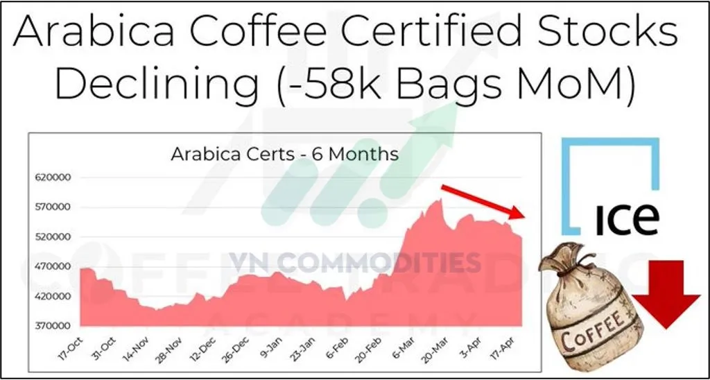 Tồn kho cà phê arabica đạt chuẩn trên ICE đang tiếp tục giảm, hiện xuống còn khoảng 515 nghìn bao, thấp hơn 58 nghìn bao so với tháng trước. Nguyên nhân chính là lượng cà phê đưa vào sàn, đặc biệt từ khu vực Trung Mỹ, đang chậm lại rõ rệt. Trong khi đó, khối lượng chờ kiểm định mới chỉ ở mức khoảng 20,7 nghìn bao và chưa tăng thêm đáng kể từ đầu tháng 4.
