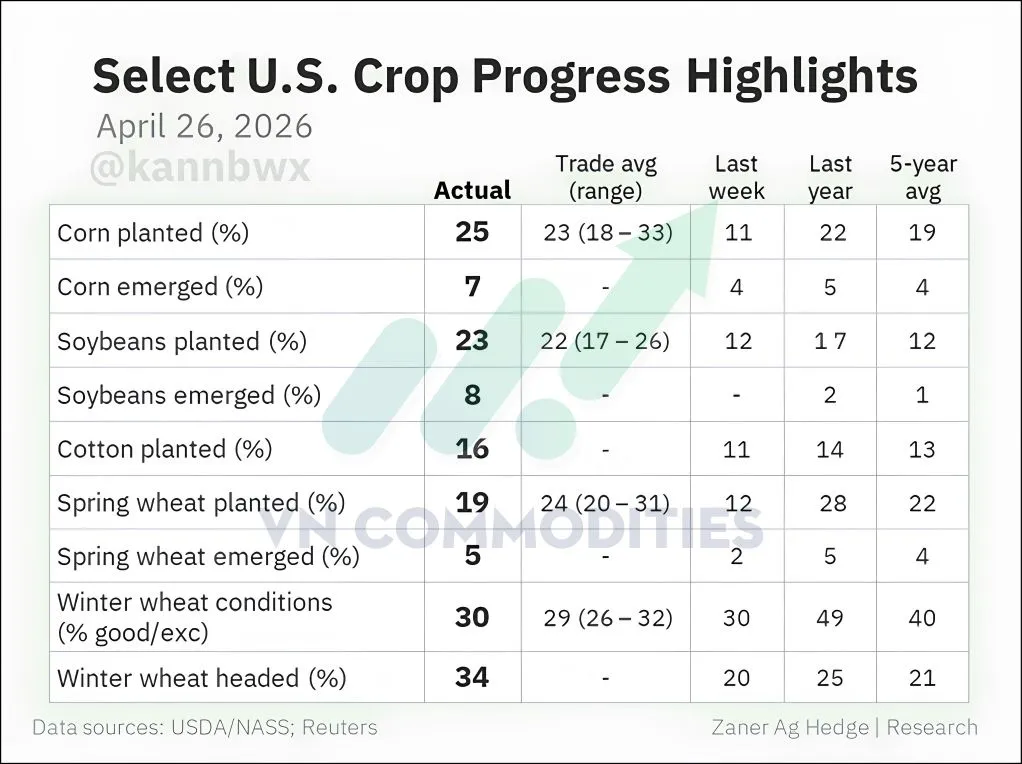 Tiến độ gieo trồng ngô tại Mỹ hiện đã hoàn thành 25%, cao hơn mức 22% của cùng kỳ năm ngoái và vượt mức trung bình 5 năm là 19%.