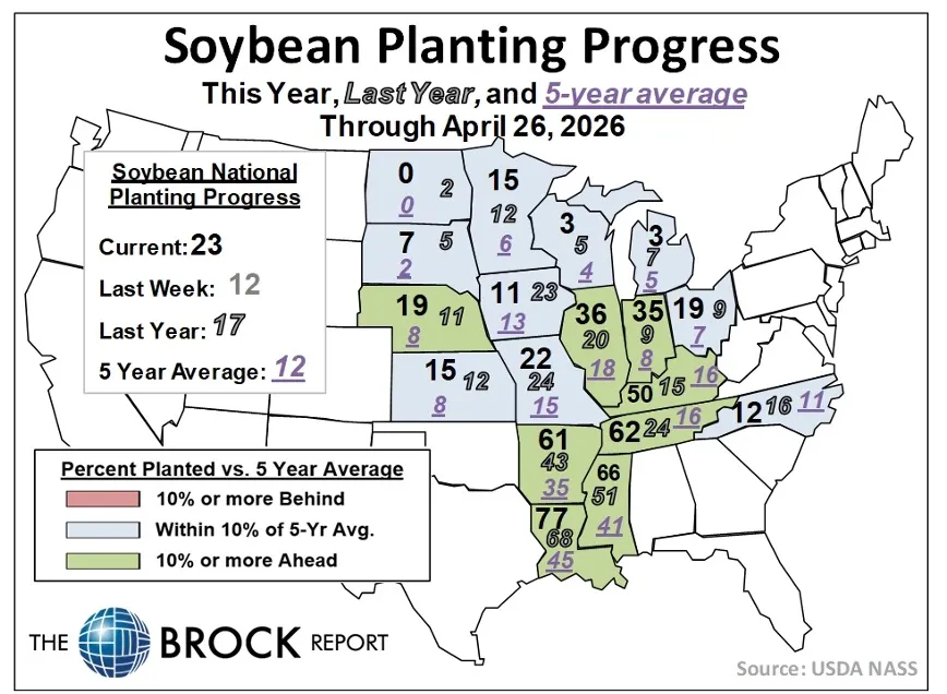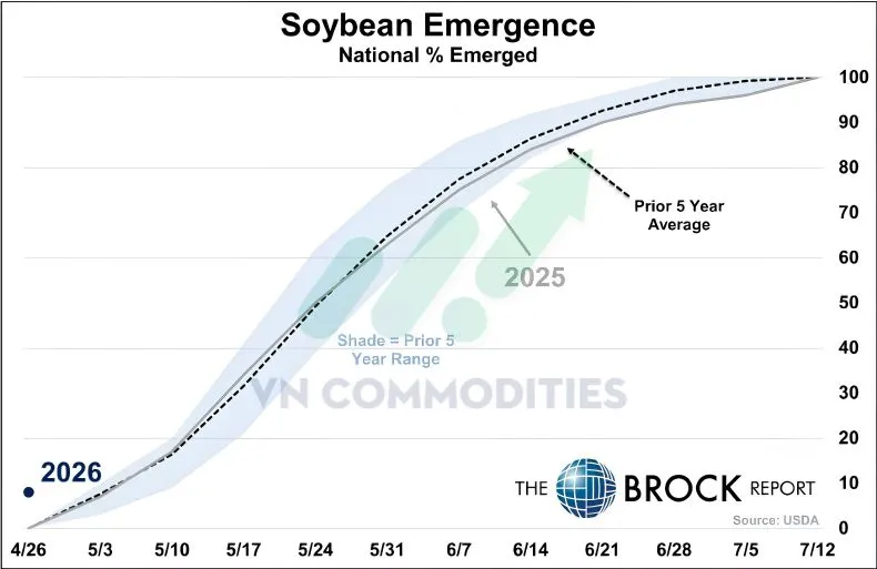 Tiến độ gieo trồng đậu tương tại Mỹ đang diễn ra khá nhanh, đạt 23%, cao hơn nhiều so với mức trung bình 5 năm là 12%. Đáng chú ý, tỷ lệ đậu tương nảy mầm cũng đã được công bố rất sớm trong năm nay, với 8% diện tích đã nảy mầm trên toàn quốc.