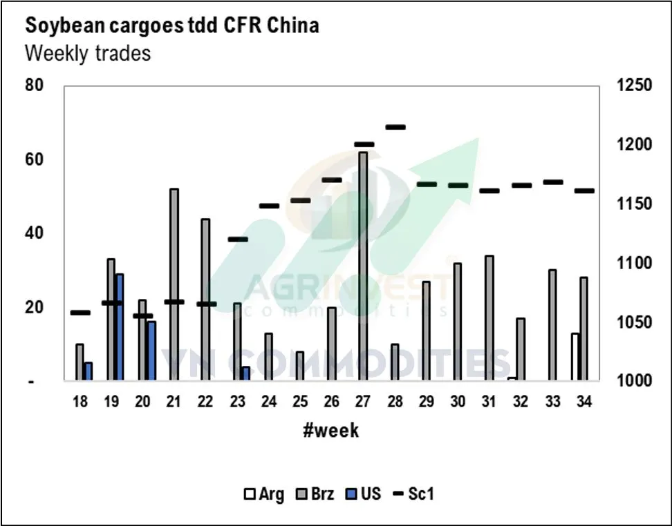 Tuần qua thị trường đậu tương giao dịch khá sôi động, với khoảng 40 lô được chốt mua từ Argentina và Brazil. Nhu cầu từ Trung Quốc cải thiện rõ rệt khi các nhà nhập khẩu tích cực mua bù cho các hợp đồng giao tháng 7. Tuy vậy, xét tổng thể, khối lượng đã mua theo điều kiện CFR Trung Quốc cho giai đoạn tháng 1–8 vẫn thấp hơn so với cùng kỳ năm ngoái.
