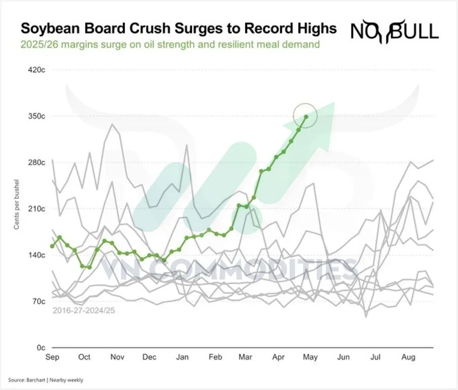 Biên lợi nhuận ép đậu tương đang tăng rất mạnh trong niên vụ 2025/26, với chỉ số soybean board crush tăng khoảng 130% từ đầu năm và vươn lên mức cao kỷ lục. Đà tăng này chủ yếu đến từ giá dầu đậu tương mạnh và nhu cầu khô đậu tương vẫn ổn định.