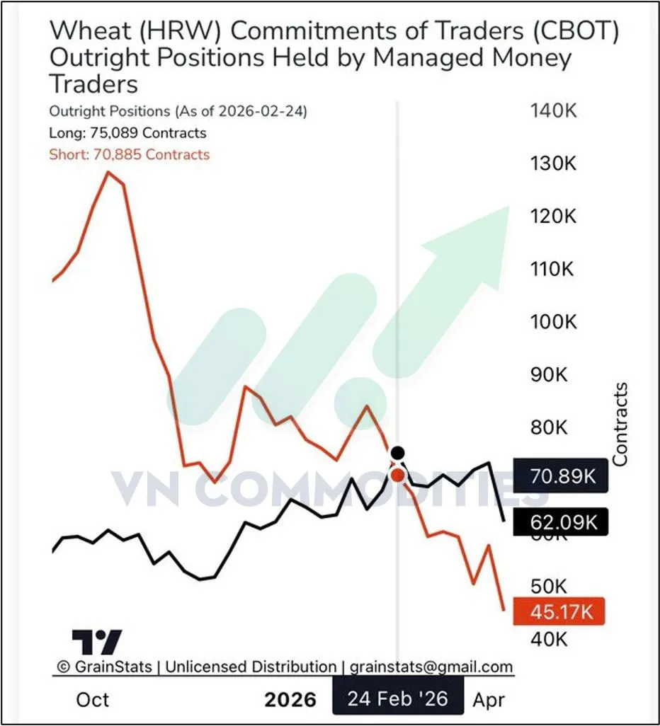 Dòng tiền đầu cơ trên thị trường lúa mì đang cho thấy tín hiệu khá “lệch pha” so với các câu chuyện nguồn cung toàn cầu. Tính đến cuối tháng 2, vị thế mua ròng của quỹ tại lúa mì KC vẫn thấp hơn đáng kể so với giai đoạn đầu xung đột, dù thị trường liên tục nhắc đến các rủi ro như khủng hoảng lương thực hay hạn hán.Trong ngắn hạn, các quỹ có thể đã cắt bớt vị thế bán (short) và thậm chí tăng nhẹ vị thế mua, nhưng nhìn chung mức độ tham gia vẫn khá thận trọng.