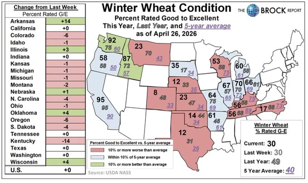 Tình trạng lúa mì vụ đông tại Mỹ gần như không thay đổi trong tuần này, với tỷ lệ được đánh giá tốt đến xuất sắc vẫn ở mức 30%, thấp hơn mức trung bình 5 năm là 40%. Dù vậy, bức tranh chung không quá tích cực: 11 bang ghi nhận chất lượng giảm, trong đó có bang sản xuất quan trọng Kansas, trong khi chỉ 5 bang cải thiện. Đáng chú ý, có 10 bang đang thấp hơn hơn 10% so với trung bình 5 năm, nhiều bang thấp hơn trên 20 điểm phần trăm. Kentucky giảm mạnh 14 điểm, còn North Carolina chỉ đạt 17% tốt/xuất sắc, thấp xa so với trung bình 5 năm 73%.