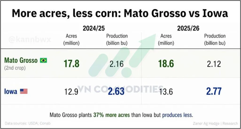 Biến động năng suất tại Mỹ đặc biệt ở các bang chủ chốt như Iowa sẽ có tác động rất lớn đến nguồn cung và giá ngô toàn cầu.