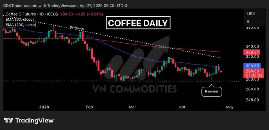 Giá cà phê tuần trước từng tạo tín hiệu tích cực khi xuất hiện nến hammer tại vùng hỗ trợ ngang, cho thấy lực mua bắt đầu phản ứng. Tuy nhiên, đà hồi phục nhanh chóng gặp cản tại đường EMA 50, nơi người bán quay lại mạnh và tạo nến giảm tiếp diễn với bóng nến trên dài. Hiện tại, giá tiếp tục chịu áp lực bán, vẫn nằm dưới các đường trung bình quan trọng và tạo các đỉnh thấp dần.