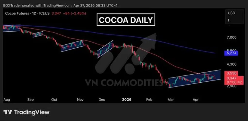 Giá cacao tiếp tục phát tín hiệu yếu khi hình thành thêm một nến giảm tiếp diễn và vẫn giao dịch dưới đường EMA 50. Dù giá đang di chuyển trong một kênh tăng ngắn hạn, các kênh kiểu này gần đây thường bị phá vỡ theo hướng giảm, cho thấy xu hướng giảm lớn vẫn còn chiếm ưu thế. Bên bán vẫn đang kiểm soát thị trường cho đến khi giá có thể phá vỡ vùng tích lũy theo hướng tăng và tạo tín hiệu đảo chiều rõ ràng hơn.